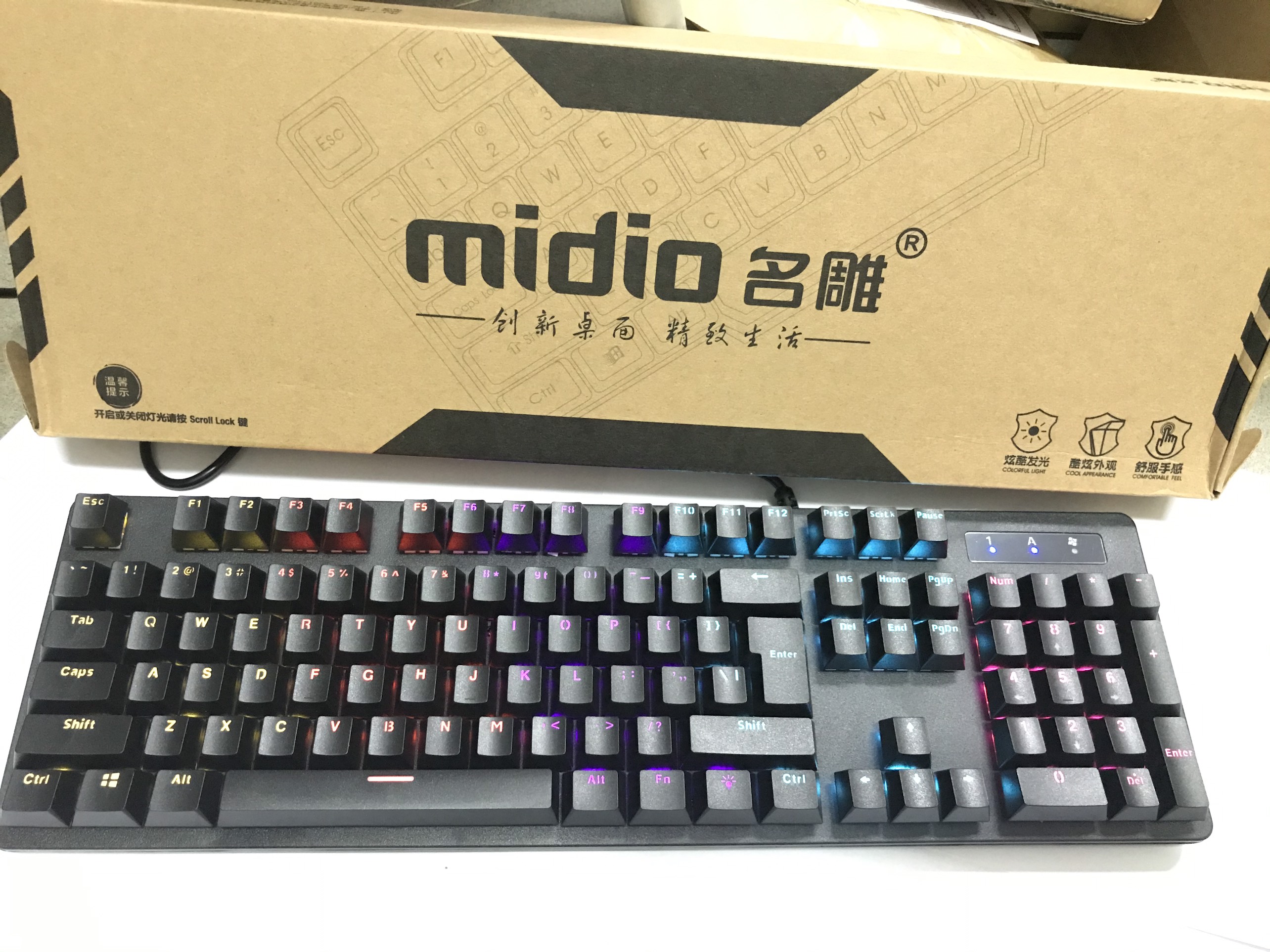 Kết nối: USB ,10 kiểu đèn led Key Cap: Double Shot hai lớp nhựa chống bay phím tuyệt đối Anti-Ghosting: ko giới hạn bấm phổ biến phím cùng lúc. Khóa phím Window: Chức năng tắt mở phím Window bằng đèn Đa phương tiện: Phím biểu tượng cái đèn +SL (ĐÈN LED ) Phím cơ MIDIO RX-902 độ bền lên đến 50tr lần click Bàn phím cơ học chuyên dụng Bàn phím cơ bản có đèn nền có thể điều chỉnh theo tiêu chuẩn. Nó có 10 phong cách điều chỉnh ánh sáng để chiếu sáng bàn phím Được thiết kế cho cảm giác cao cấp, độ bền và hiệu năng. Hoạt động nhanh hơn và độ chính xác khi chơi game. Vật liệu cao cấp. Quy trình ép phun màu, hợp kim siêu cấu trúc. Khả năng giải trí và âm thanh giải trí đa phương tiện Blue Key Switches cho phép đánh máy tuyệt vời và cảm ứng khi chơi game.