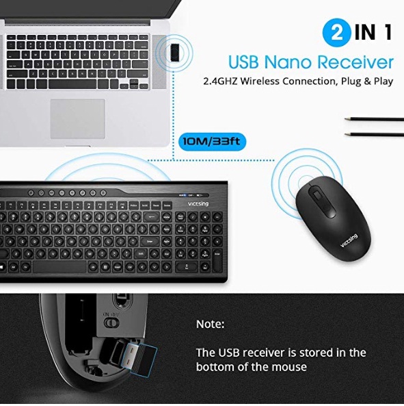 Kết nối 2,4 GHz đáng tin cậy. USB nano nhận chỉ sử dụng một cổng USB để kết nối bàn phím và chuột không dây.